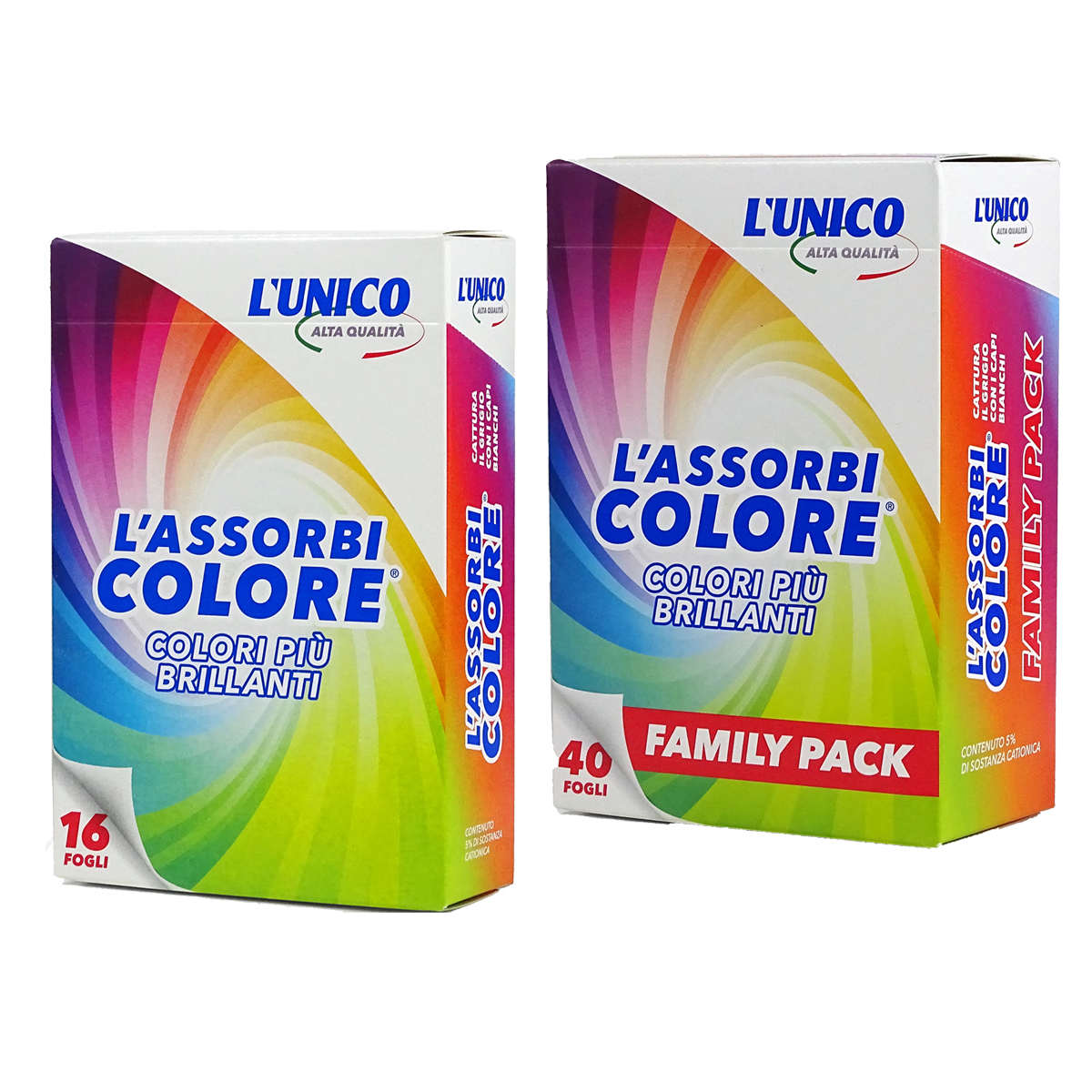Protegge il tuo bucato dagli incidenti di lavaggio e ti permette di lavare tutti i capi colorati insieme, facendoti risparmiare energia, acqua e detersivo, e aiutandoti a rispettare l’ambiente. L’ASSORBICOLORE® impedisce il trasferimento dei colori dispersi nell’acqua durante il ciclo di lavaggio.